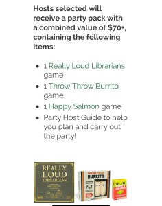 I LOVE this company! Head on over here to apply to host a Really Loud Librarians Game Night from Tryazon! There are 100 spots available. Good luck!