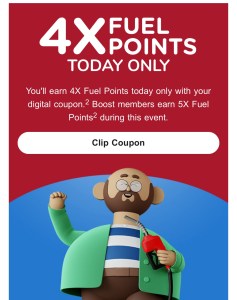 Today only (this is available on Fridays), you can grab 4X fuel points with your Kroger shopping trip! Click here to clip the coupon and add it to your account before you complete your shopping!
