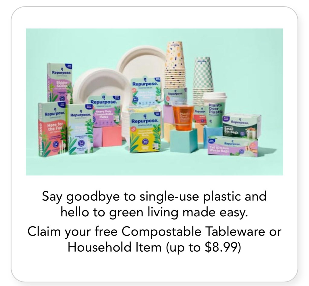 Enter your email here to get a digital offer for a FREE Compostable Tableware or Household item up to $8.99. It’s valid at Metro Market, Pick ‘n Save, Fred Meyer, Rite Aid, Meijer, Giant, Ralphs, Giant, Food 4 Less, Stop & Shop, QFC, Hannaford, Mariano’s, and Kroger. It’s valid until 3/1/25.