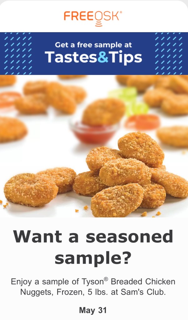 Anyway, on May 31st, Sam’s Club Stores will be offering shoppers samples of Tyson chicken nuggets! I do not see a specific timeframe for this, so I am guessing it is just until they run out of the amount of nuggets they are sharing with us.